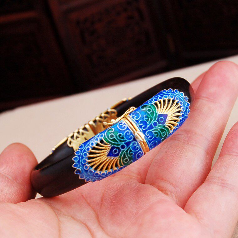 S925纯银复古民族汉风景泰蓝天然黑檀木凤尾个性气质女士开口手镯