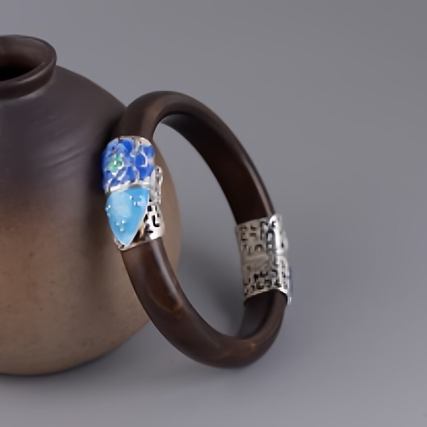 纯银开口手环复古富贵牡丹花烧蓝黑檀木手镯蝙蝠民族风景泰蓝镯子