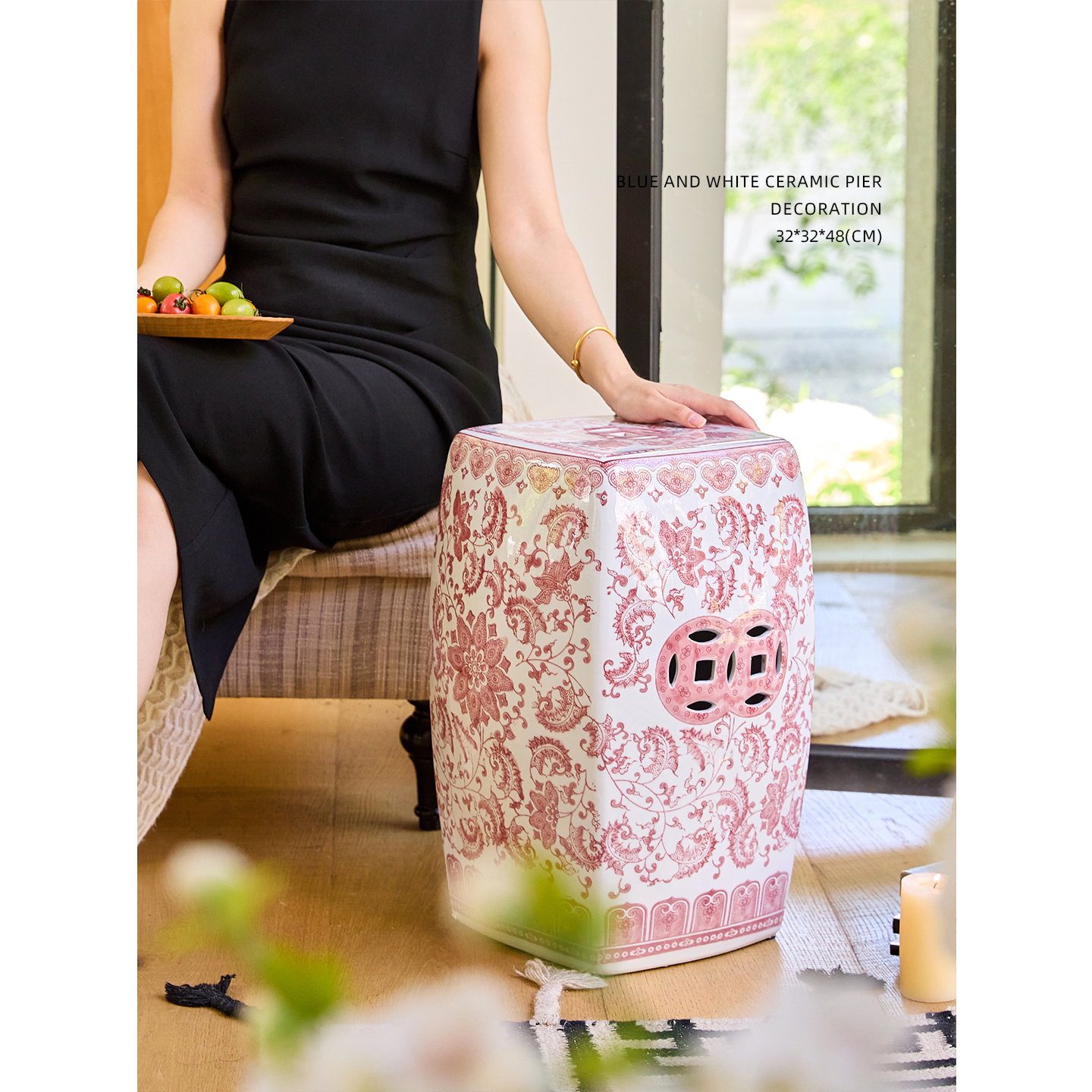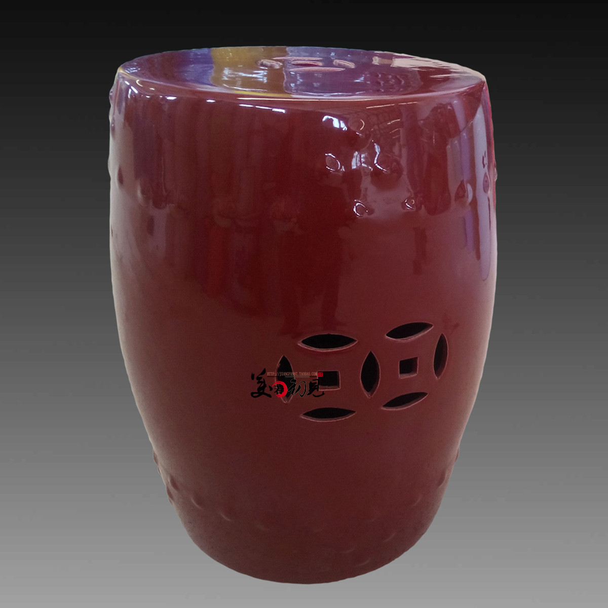 中式四方窑变复古陶瓷凳子红色镂空手工墩鼓凳乔迁结婚家居换鞋凳