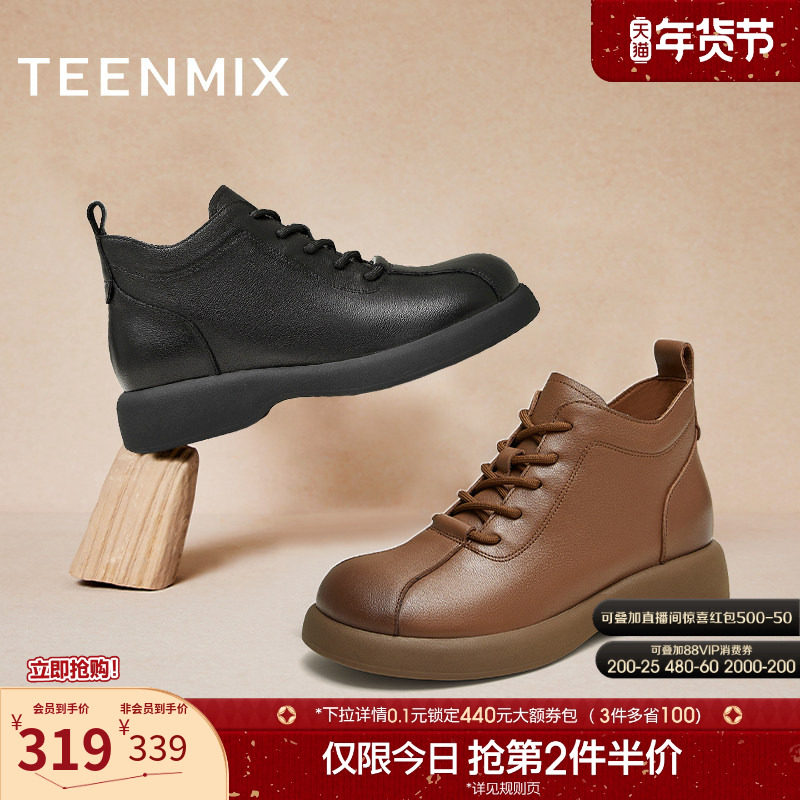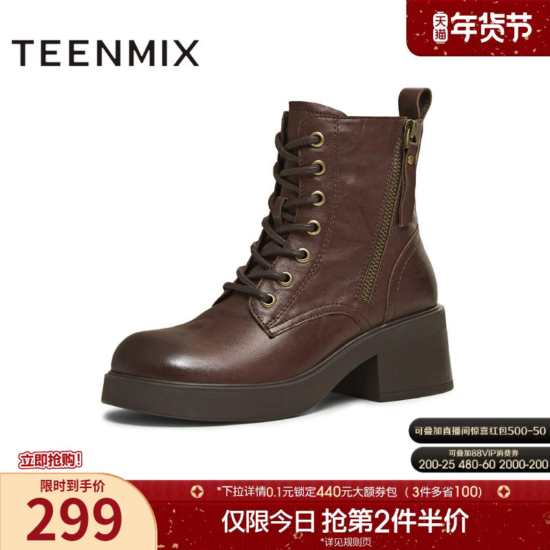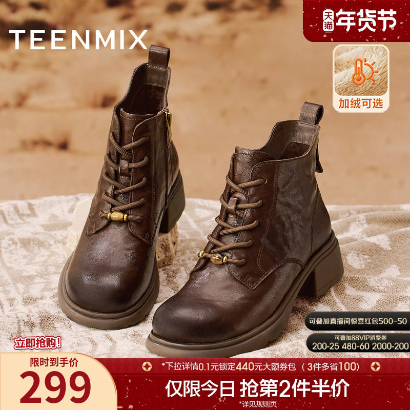 - 圆头平底系带短靴女