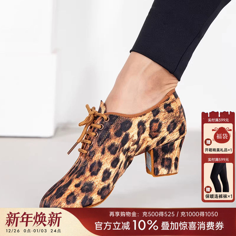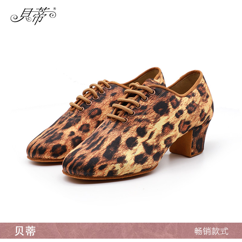 贝蒂拉丁舞鞋教师鞋女式软底时尚豹纹两点底系带交谊舞鞋T1-B