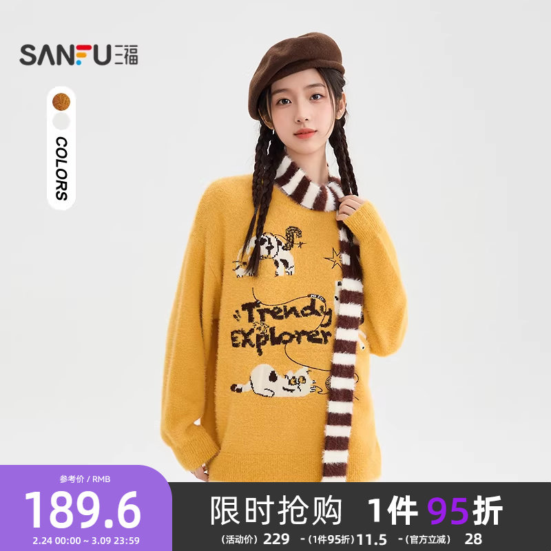 三福套头毛衣秋冬女2025新款条纹围巾猫咪绣花宽松上衣女装511628
