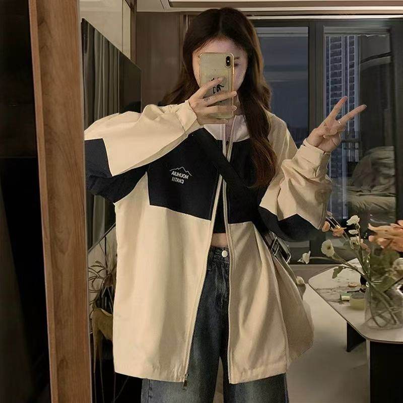 美式拼接冲锋衣外套女2025春秋新款宽松大码学生情侣休闲工装风衣