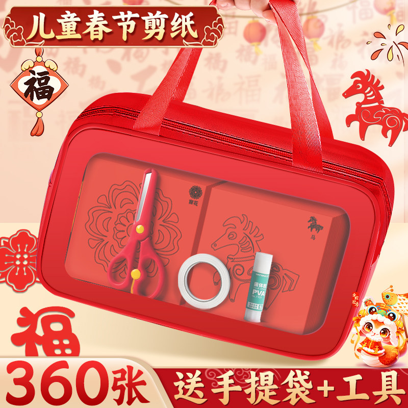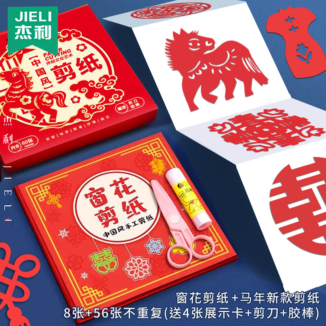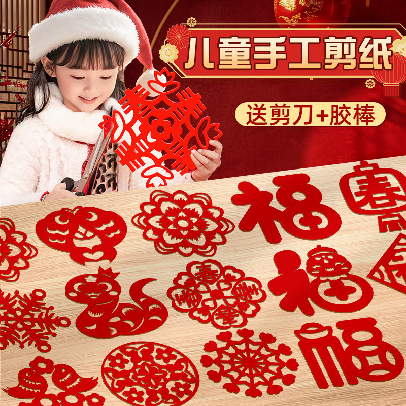 新年窗花剪纸儿童手工幼儿园diy图案大全专用纸张红纸福字小学生马年春花传统春节趣味套装作品半成品3到6岁