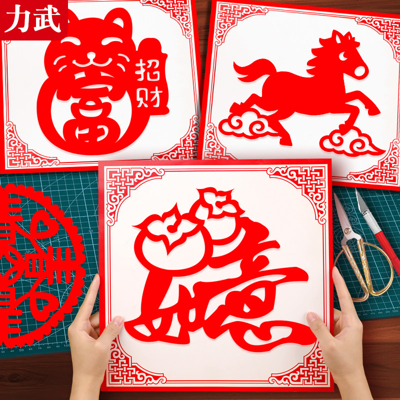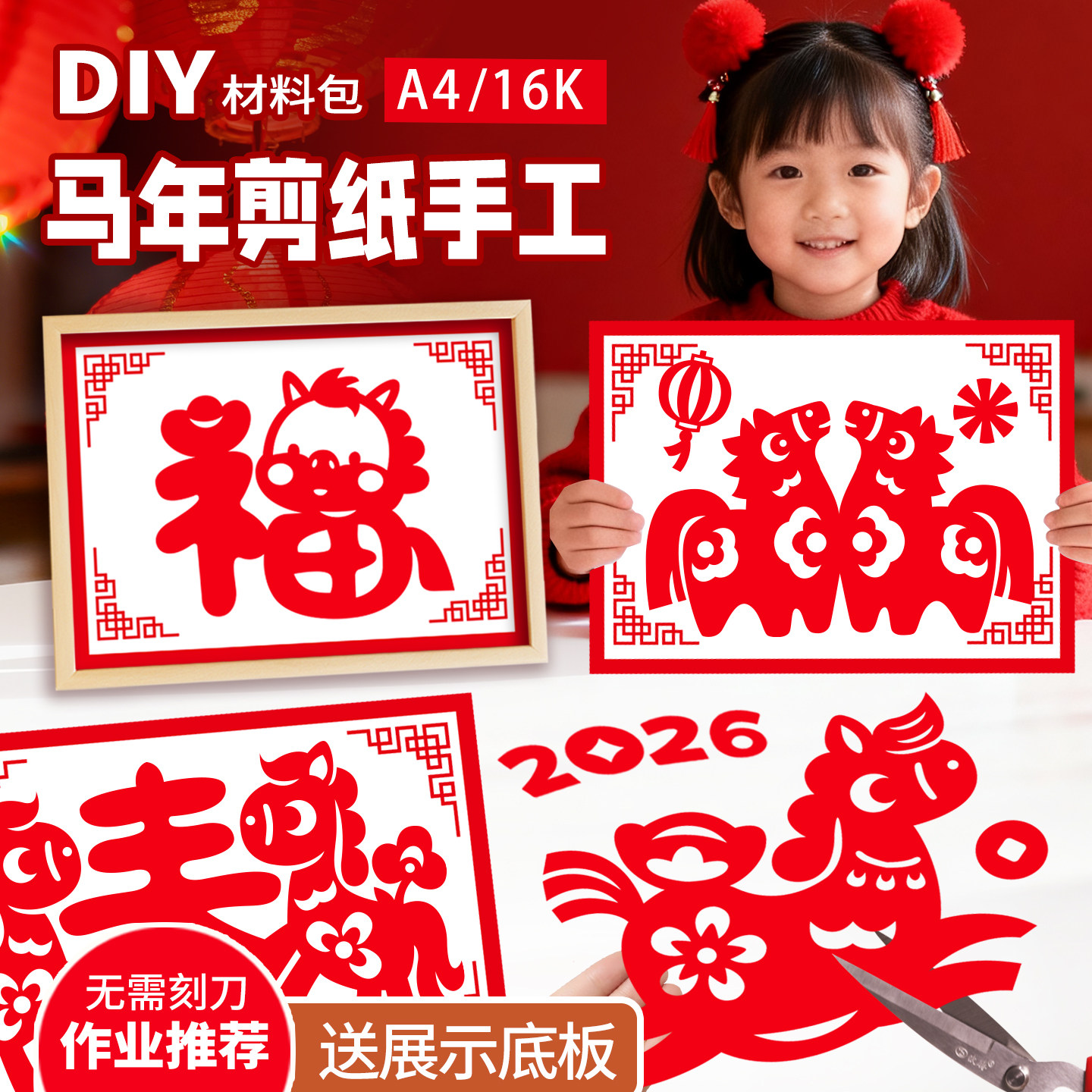 剪纸儿童手工中国风2026马年传统图案底稿幼儿园材料包diy新年十二生肖非遗大红纸春节福字小学生专用窗花纸