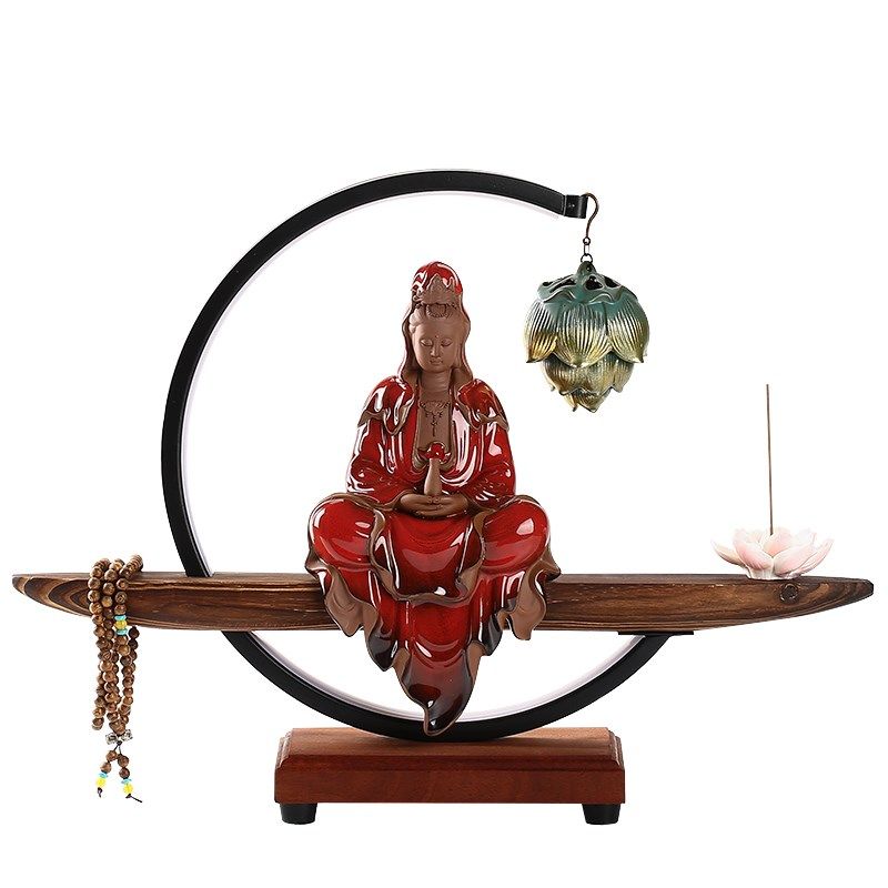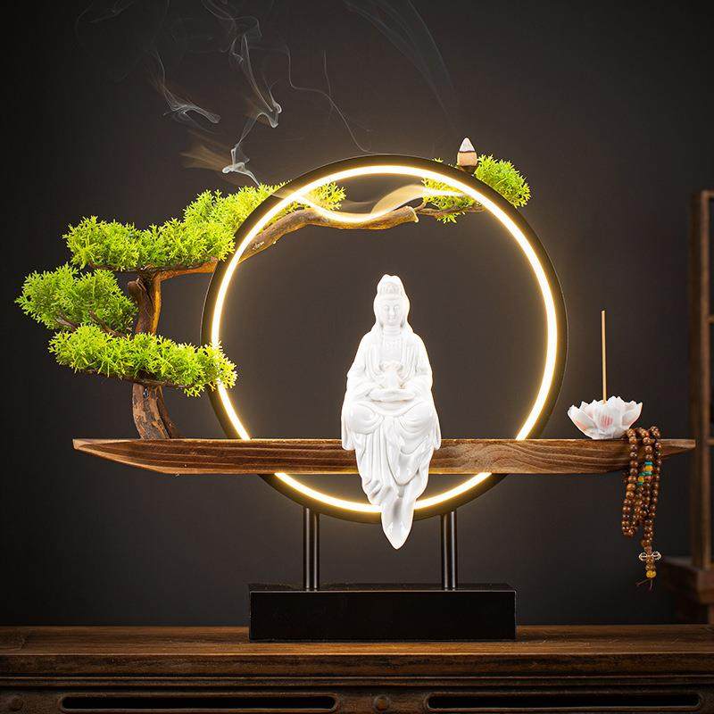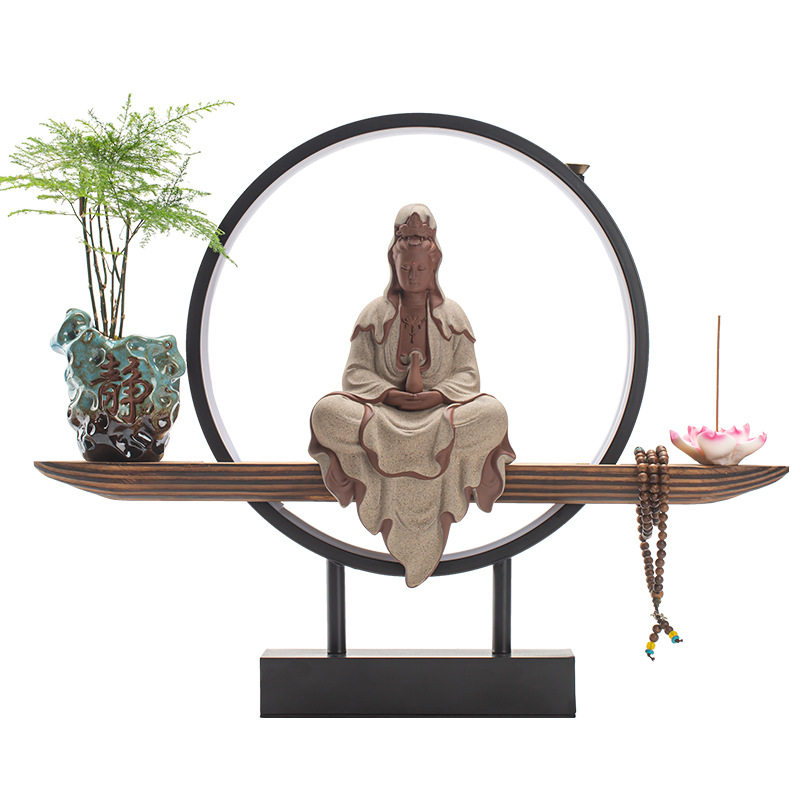 中式禅意摆件观世音菩萨佛像陶瓷家用灯圈客厅供奉倒流香玄关装饰
