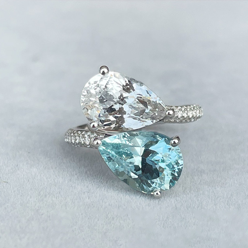 “Toi et Moi”丹宁蓝 双色宝石戒指海蓝宝S925纯银镀18K白金钻戒