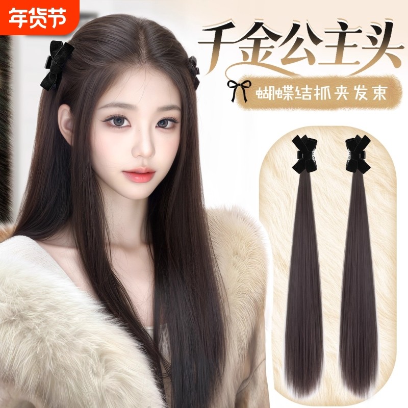 假发辫子女蝴蝶结半扎双马尾发束增发量长辫子公主头抓夹发饰挑染