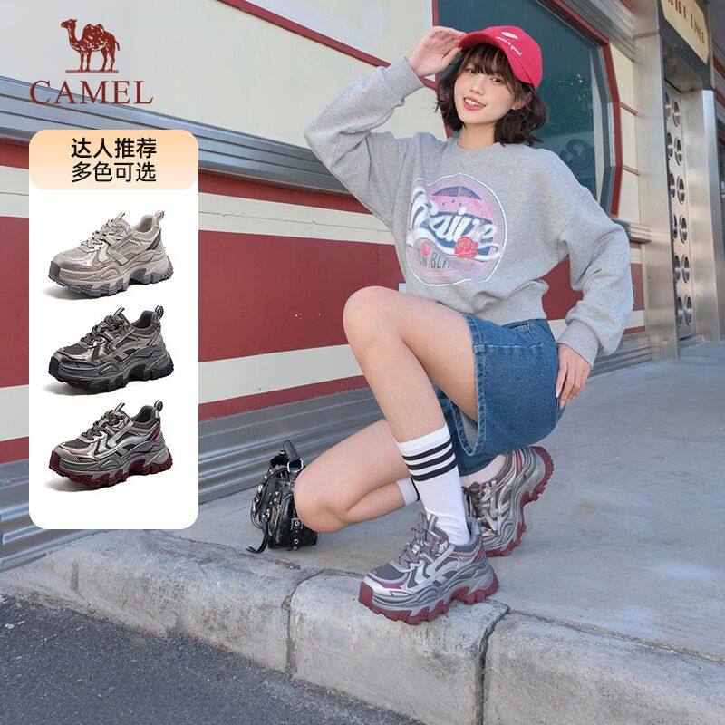 骆驼女鞋2026春季新款老爹鞋银色厚底户外运动鞋增高百搭休闲鞋女