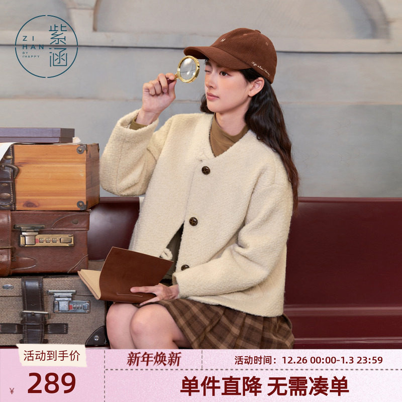 紫涵圆领羊毛短外套上衣女冬季新款甜美简约宽松休闲保暖毛呢大衣