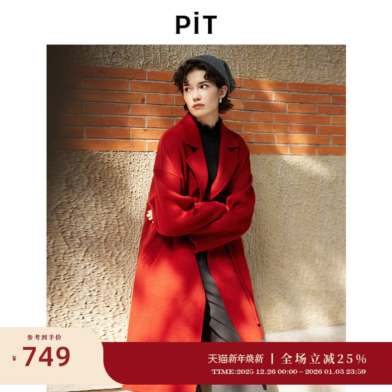 PIT鸿运红色呢子大衣女秋冬新中式休闲通勤双面100绵羊毛呢外套