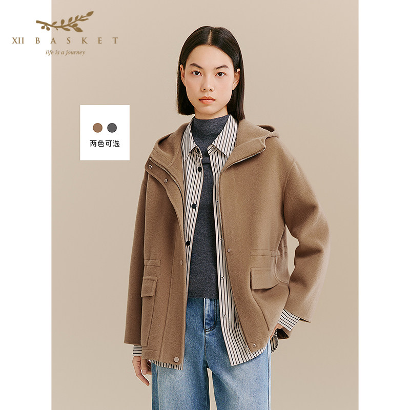 十二篮25冬新款羊毛羊绒复古轻通勤毛呢外套女休闲百搭连帽大衣