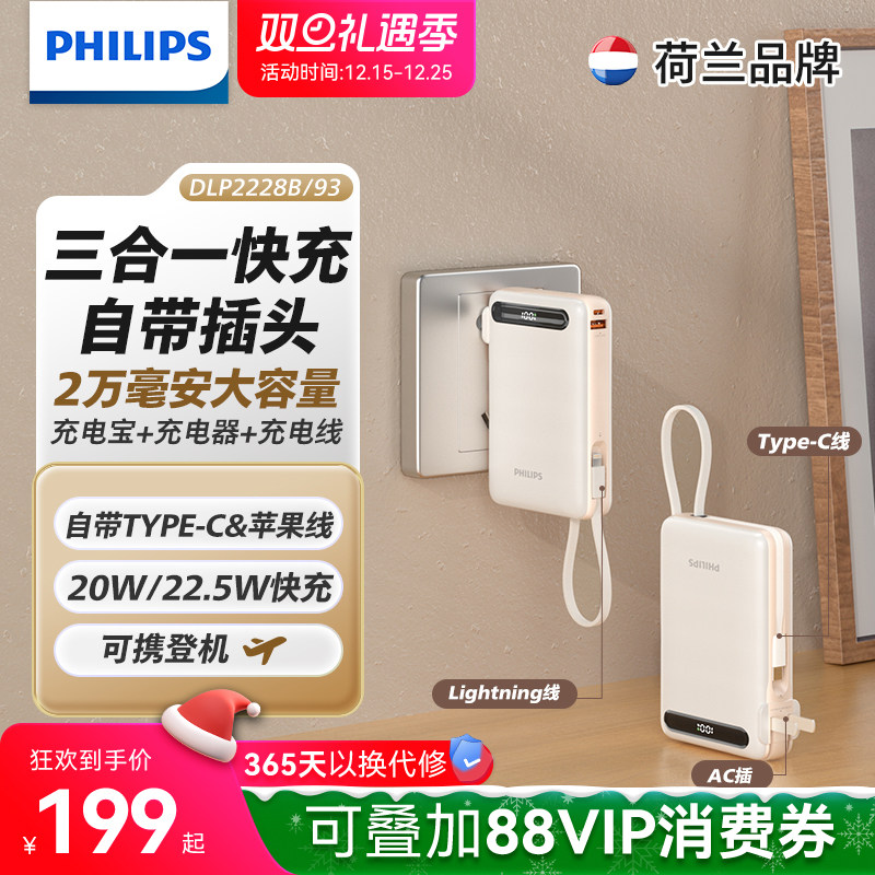 【自带AC插头】飞利浦三合一充电宝20000毫安大容量自带线快充移动电源适配华为苹果小米【3C认证可上飞机】