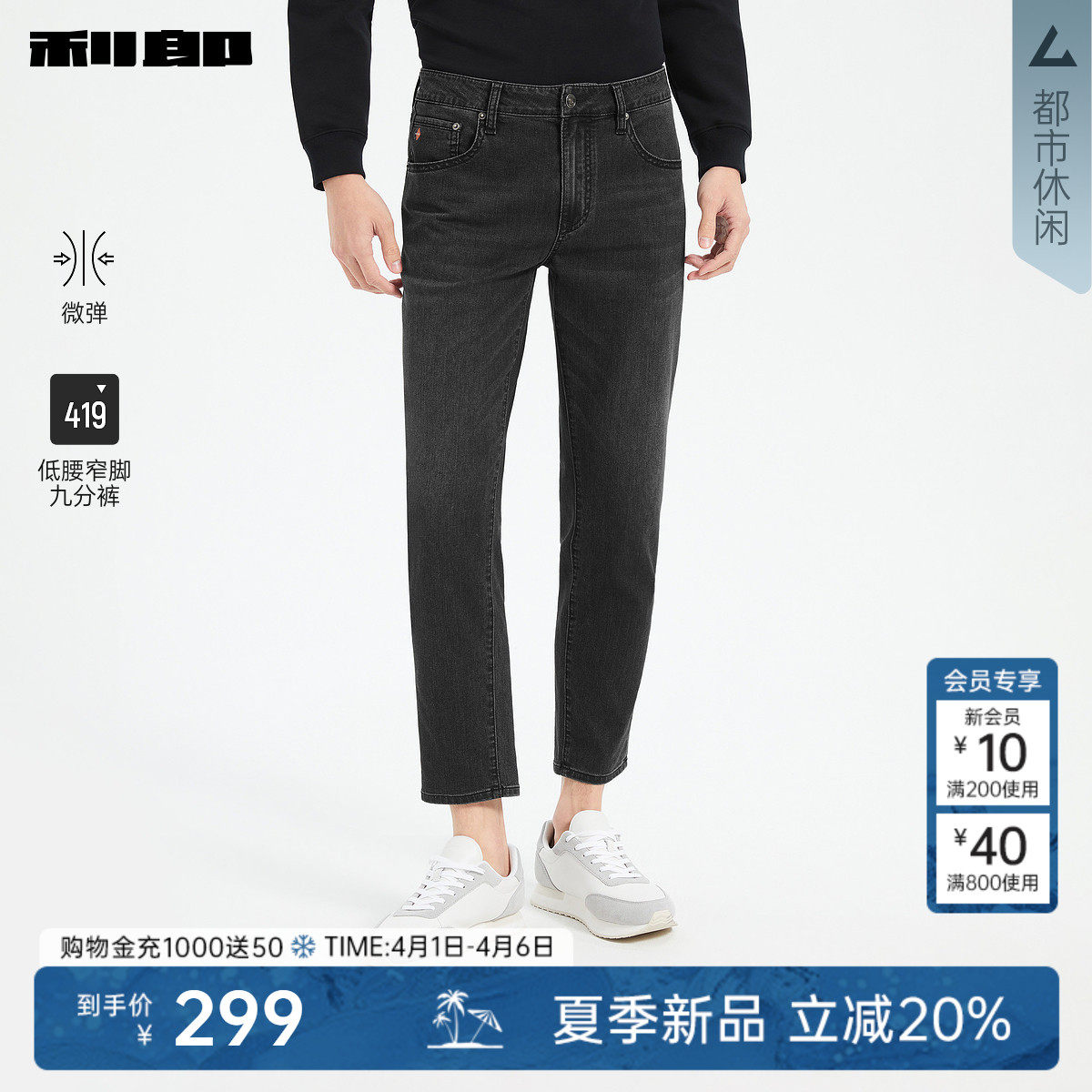 【九分裤】利郎官方 牛仔裤男士修身小脚弹力印花夏季新款裤子男