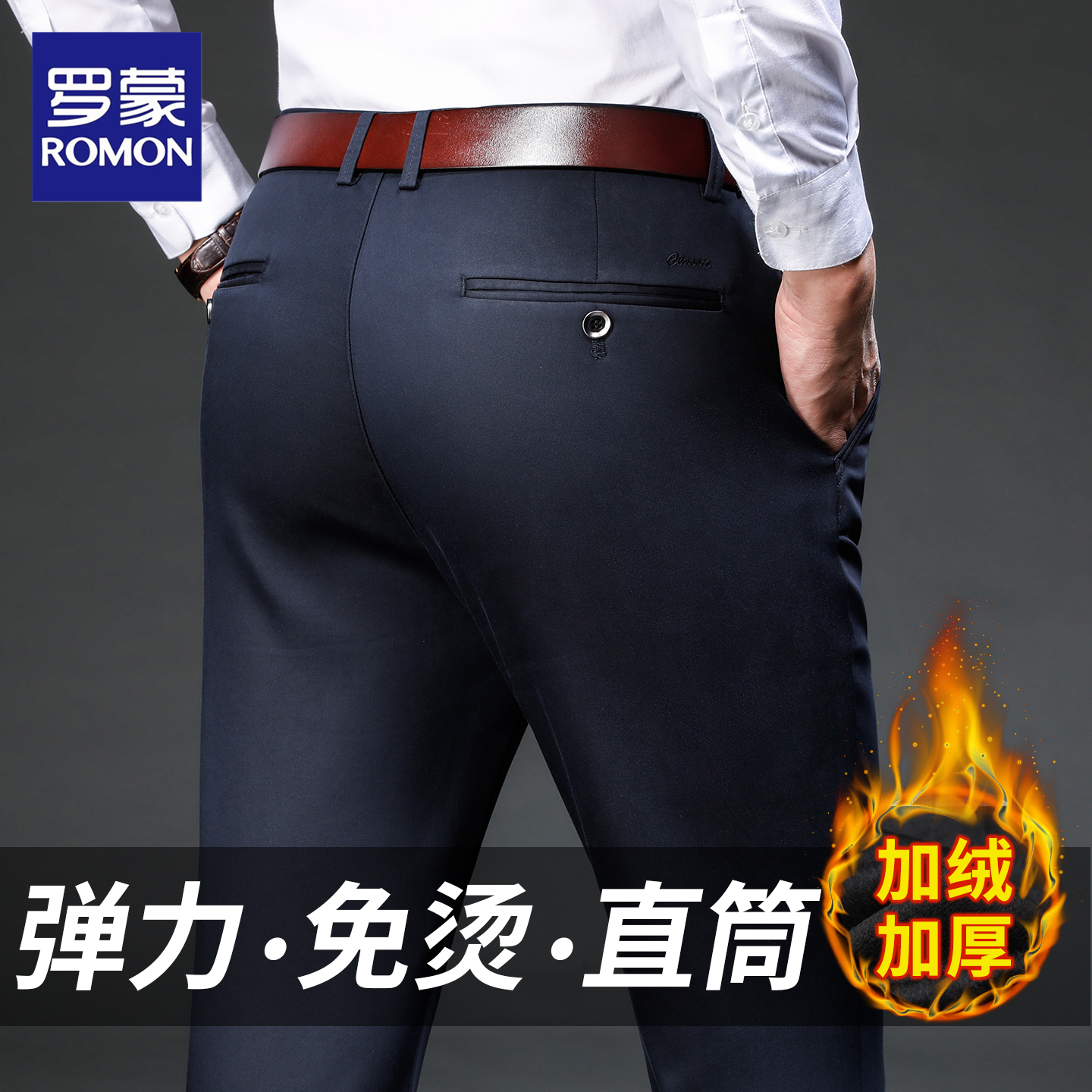 罗蒙四面弹男士休闲裤秋冬新款中年直筒商务西裤加绒免烫高弹男裤