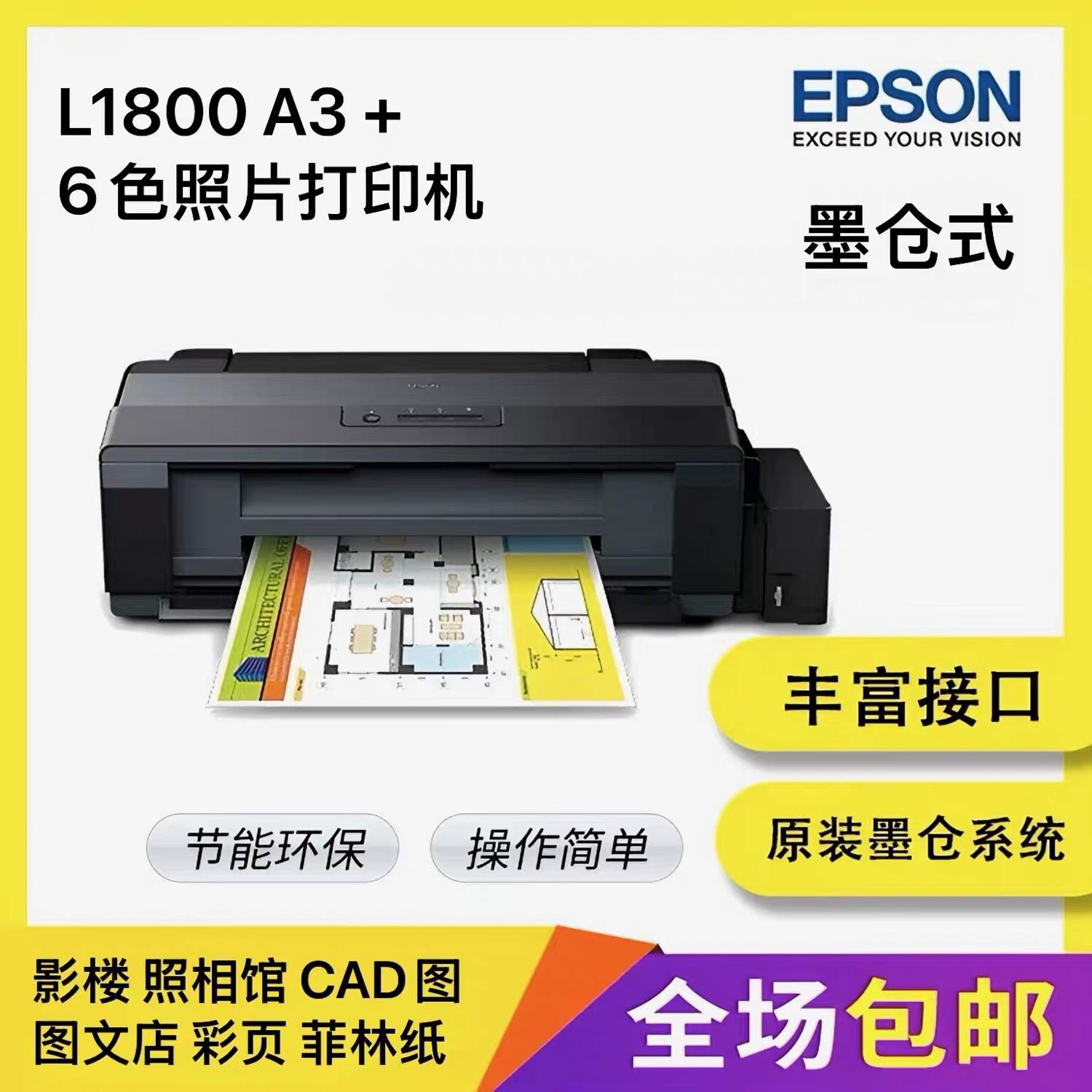 爱普生原装墨仓式L1300高速出图设计图纸CAD喷墨菲林A3手机打印机