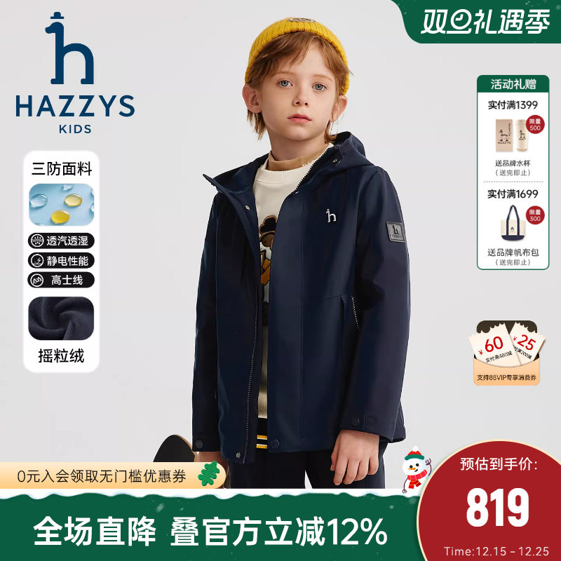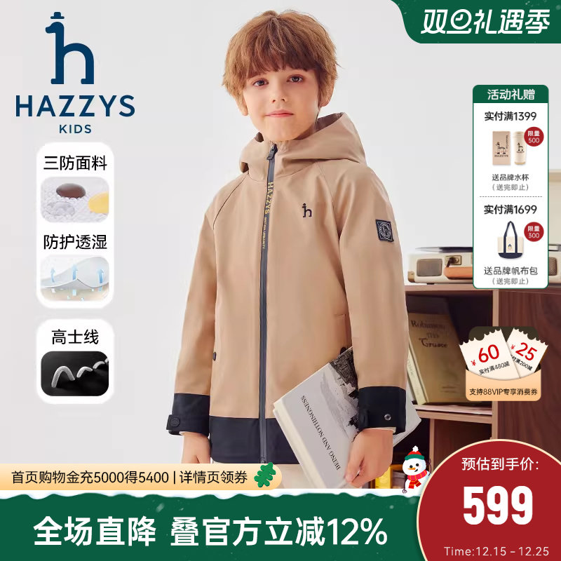 hazzys哈吉斯童装男童风衣2025秋新舒适三防加绒连帽厚外套