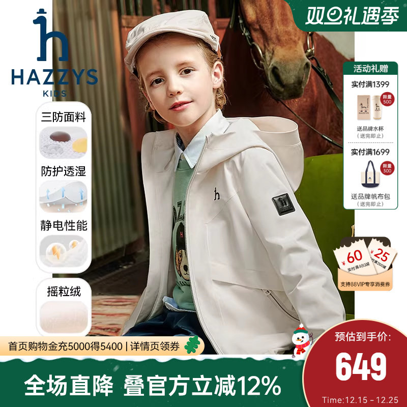 hazzys哈吉斯童装男童风衣25秋冬中大童透湿连帽加绒厚外套