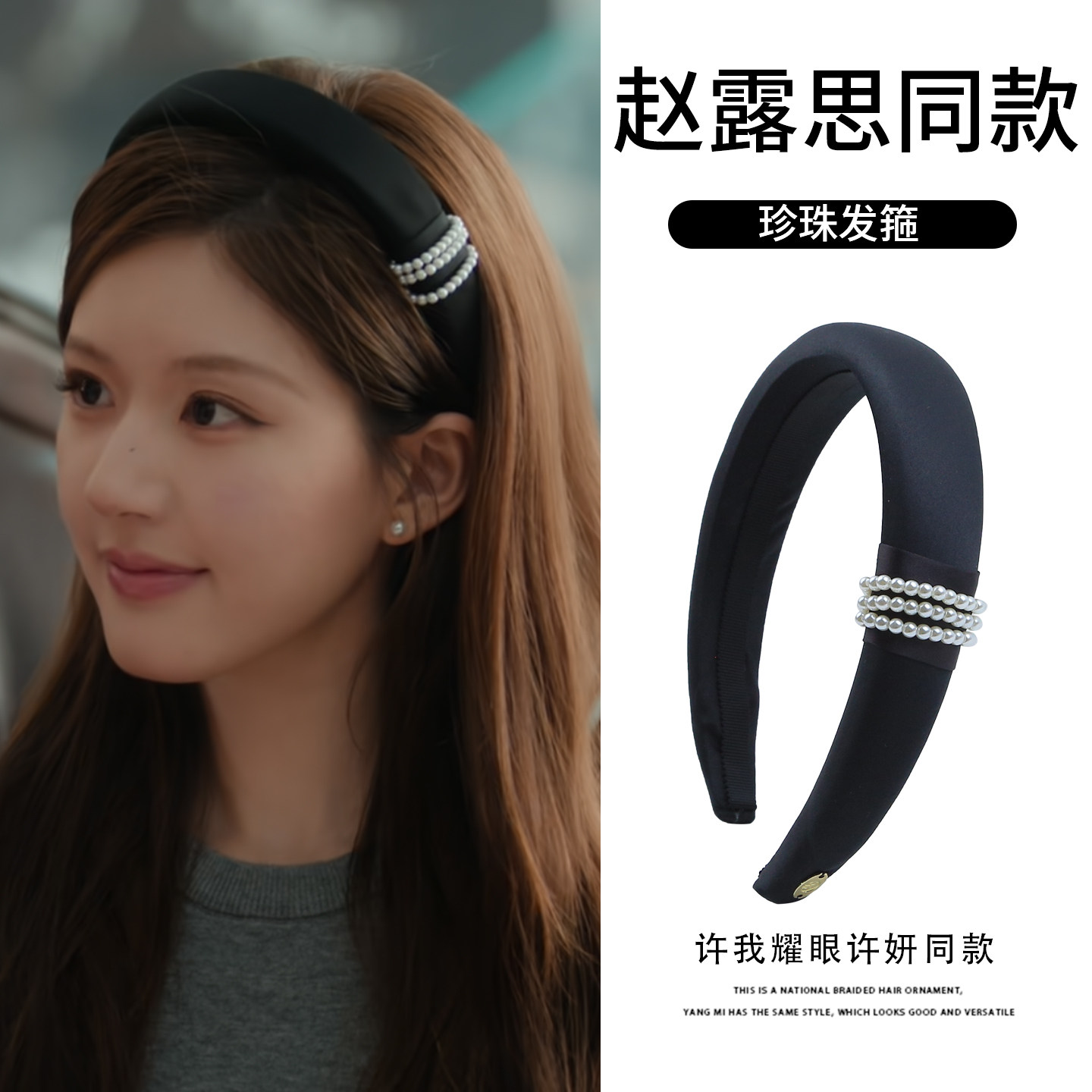 赵露思许我耀眼许妍同款精致黑色缎面珍珠发箍头饰女轻奢头箍发饰