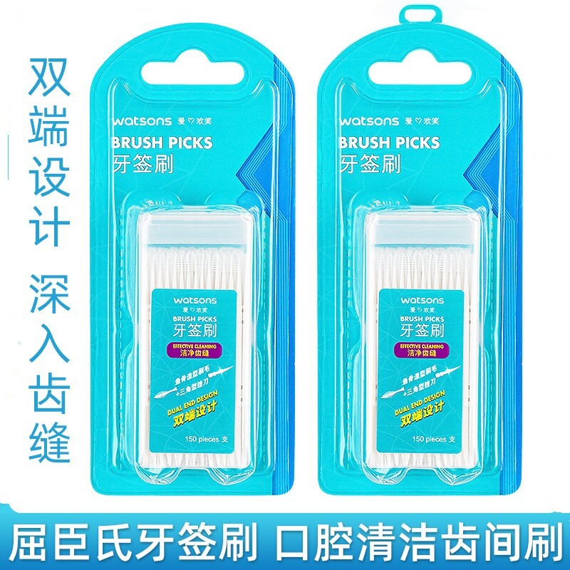 屈臣氏正品牙签刷牙线棒150支*4盒共600支双头鱼骨叶形塑料牙缝刷