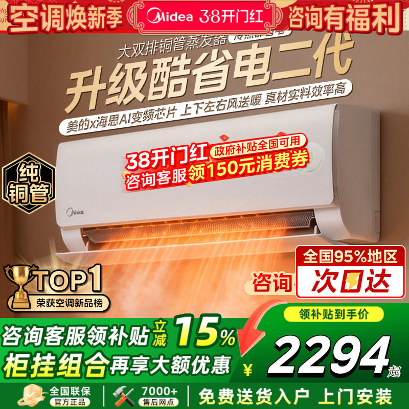 美的空调酷省电二代大1.5匹2匹一级变频冷暖挂机冷静星官方旗舰店