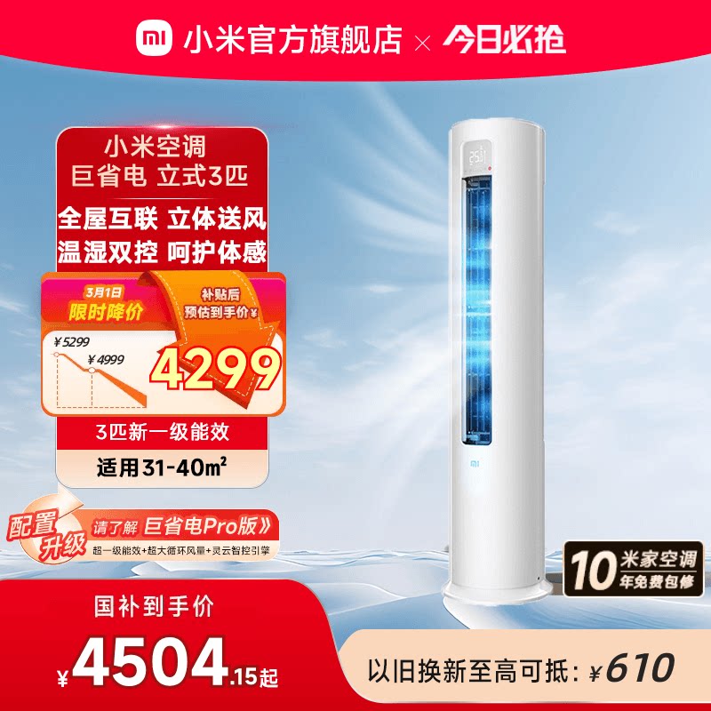 小米米家空调巨省电立式3匹一级能智能家用冷暖柜机湿温双控节能