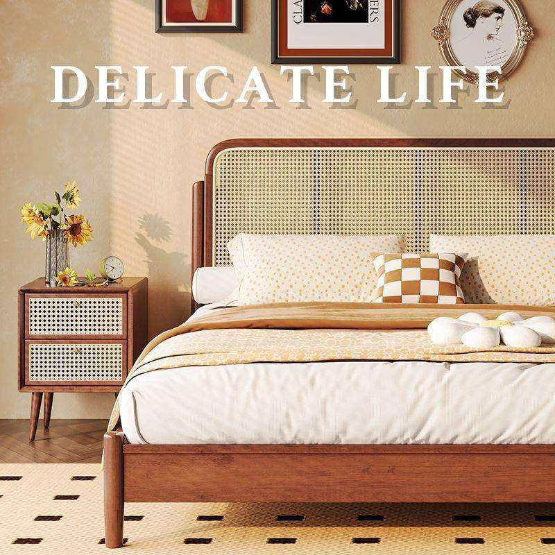 藤编日式实木床黑胡桃木北欧复古1.8米双人床简约樱桃木床民宿风