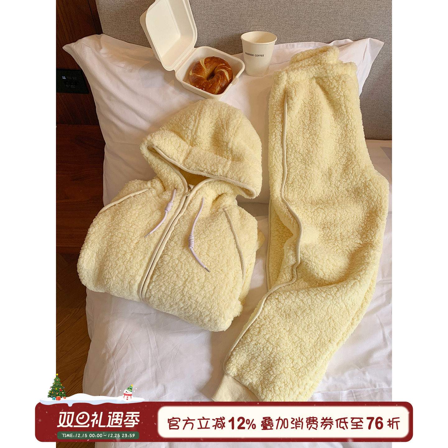 馨帮帮Homedress 羊羔绒连帽睡衣女冬季加绒加厚可外穿家居服套装