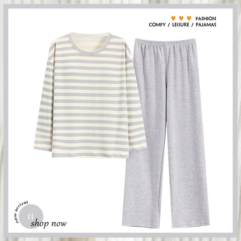 浪莎2025年新款睡衣女春秋纯棉长袖条纹休闲宽松可外穿家居服套装
