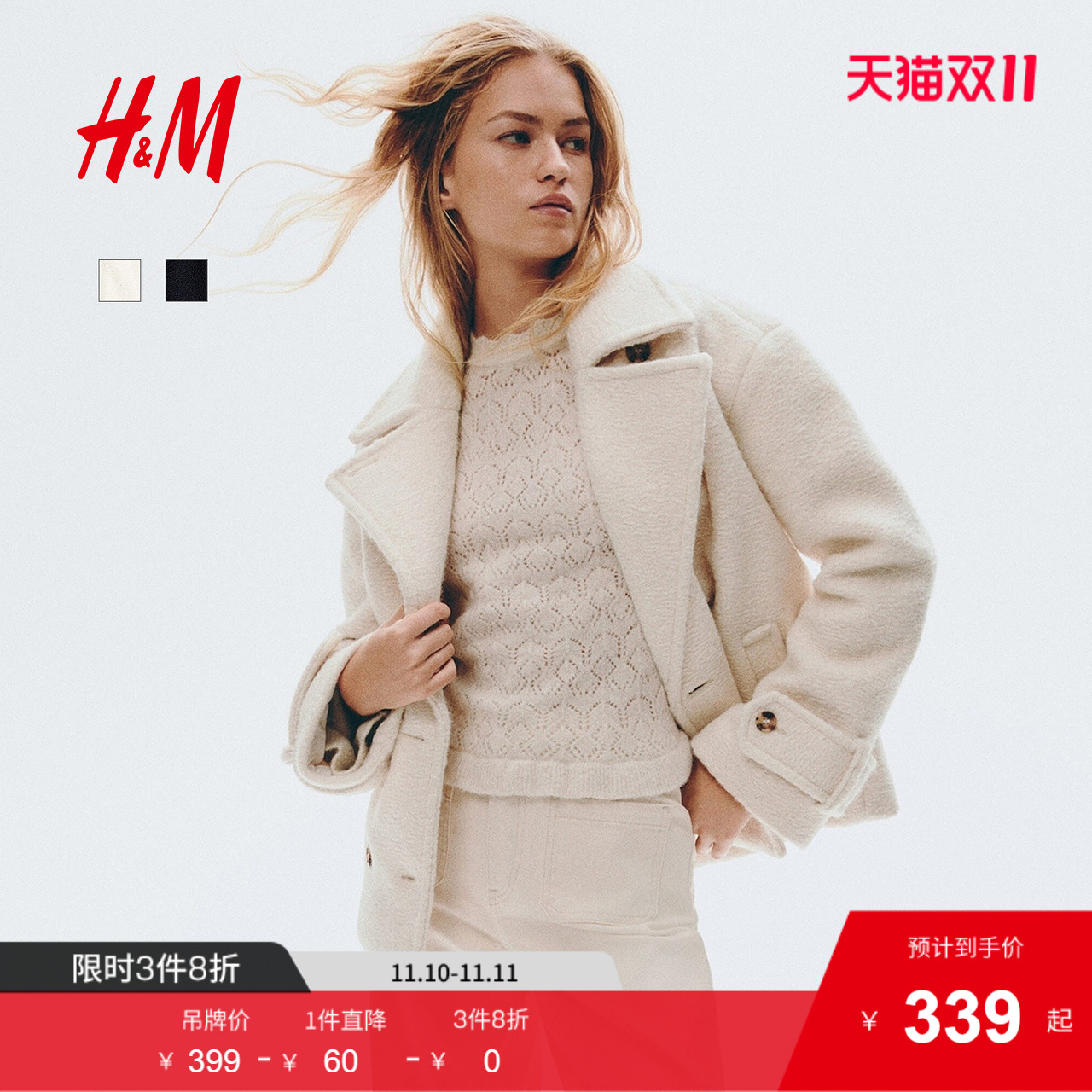 HM女装毛呢外套2025秋冬新款双排扣短款宽松翻领毛绒大衣1301400