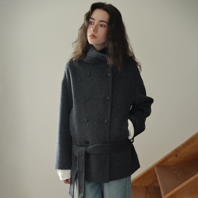 深灰色立领小个子双排扣短款大衣女2025秋冬新款双面羊毛呢子外套