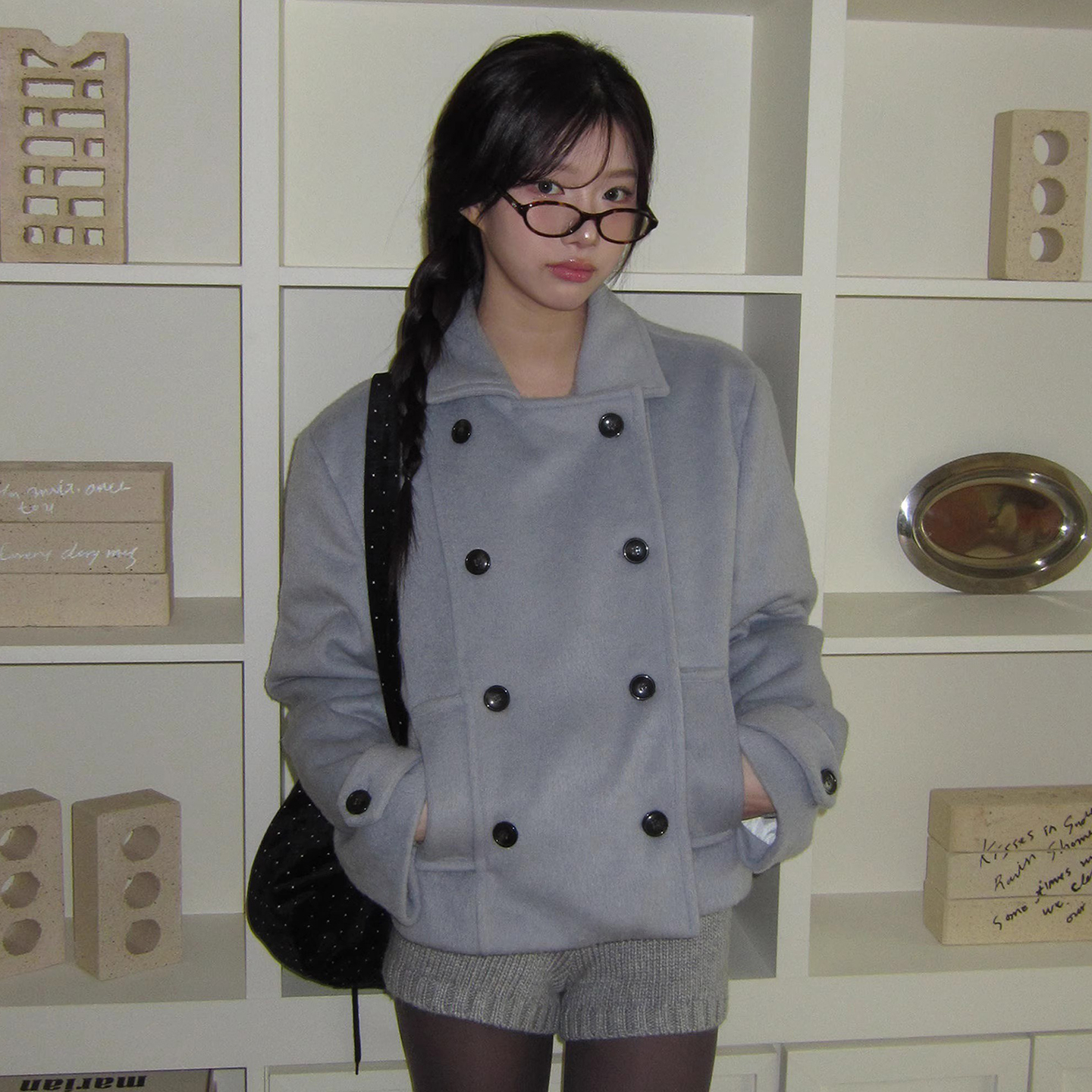 纯色宽松廓形西装领双排扣短款大衣2024冬新款长袖女毛呢外套J059