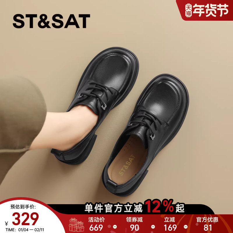 星期六真皮牛皮厚底乐福鞋女鞋2025秋季新款英伦风系带小皮鞋单鞋