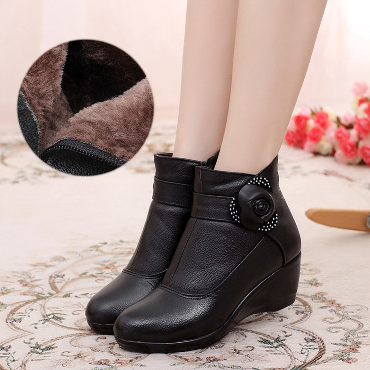 秋冬真皮女棉鞋加绒妈妈鞋中老年人坡跟舒适中跟休闲皮女短靴小码