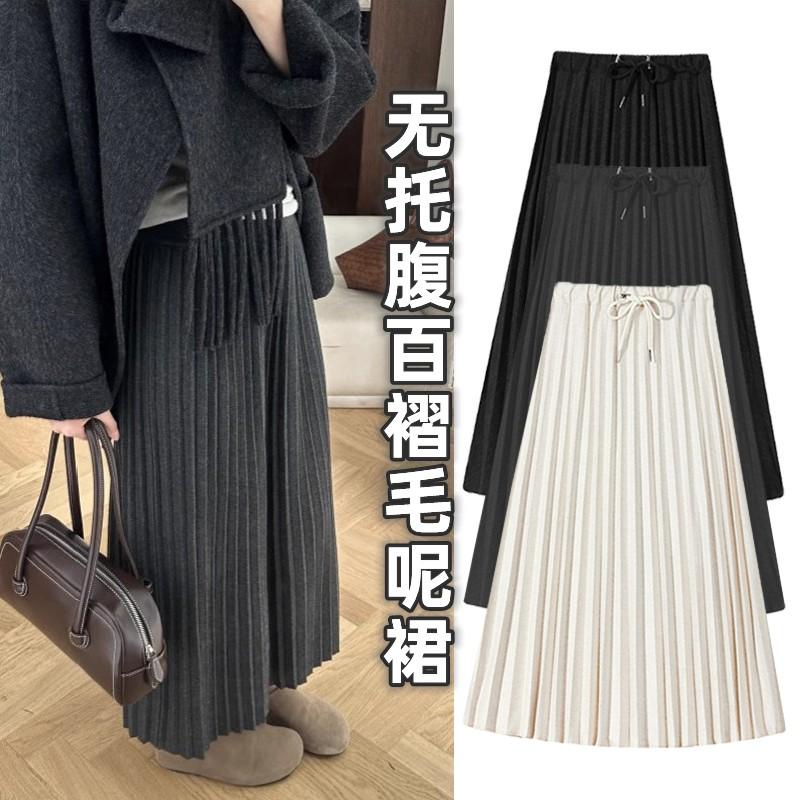 孕妇毛呢半身裙2025秋冬季新款外穿宽松托腹百褶裙中长款a字裙子
