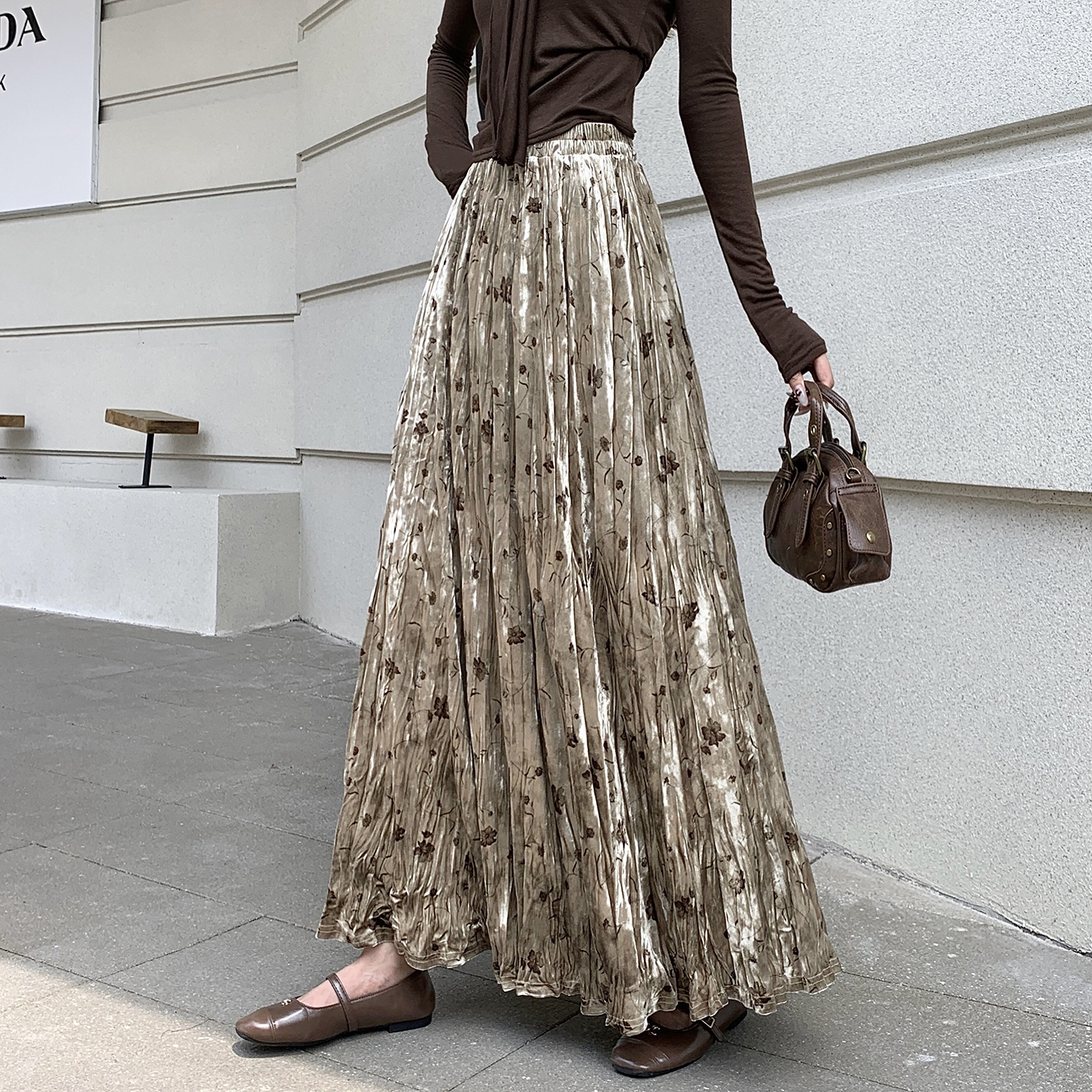 金丝绒碎花半身裙女2025秋冬新款高腰显瘦百褶中长款大摆a字裙子