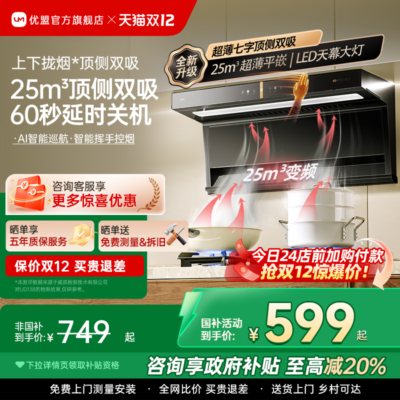 优盟抽油烟机燃气灶套餐7字烟机灶具套装家用厨房大吸力顶侧双吸