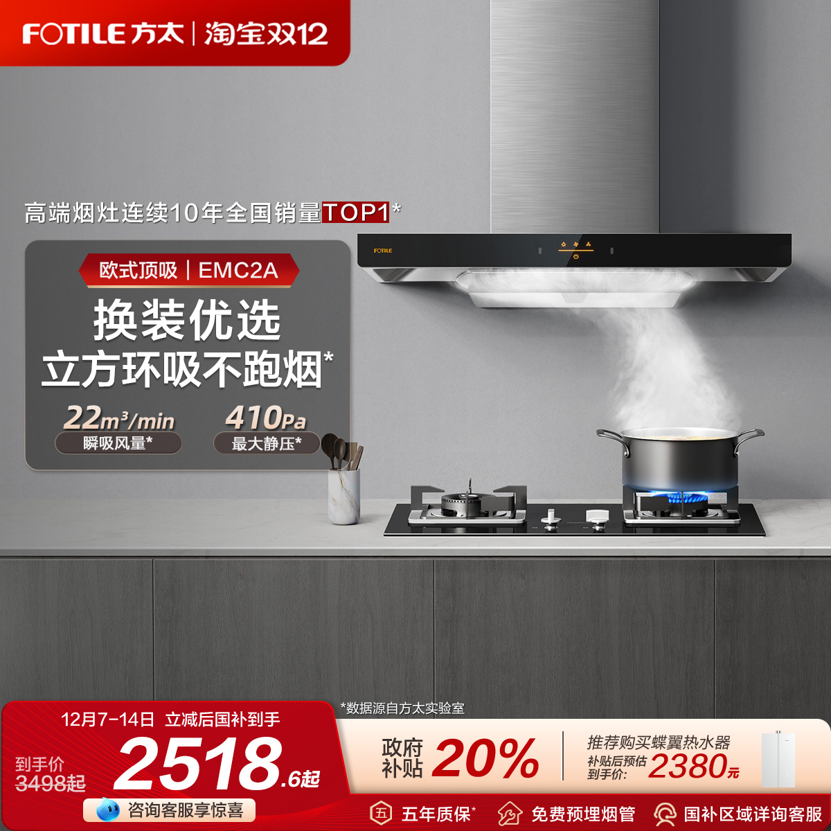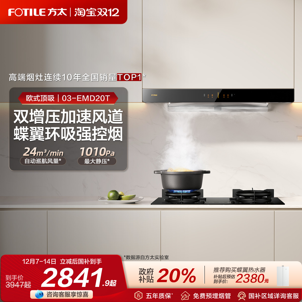 [政府补贴]方太03-EMD20T顶吸抽油烟机燃气灶具厨房家用套装套餐
