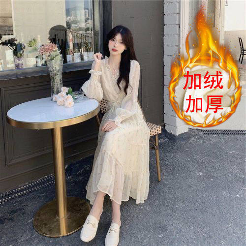 加绒2023春季新款仙女裙长裙子超仙法式初恋温柔雪纺长袖连衣裙