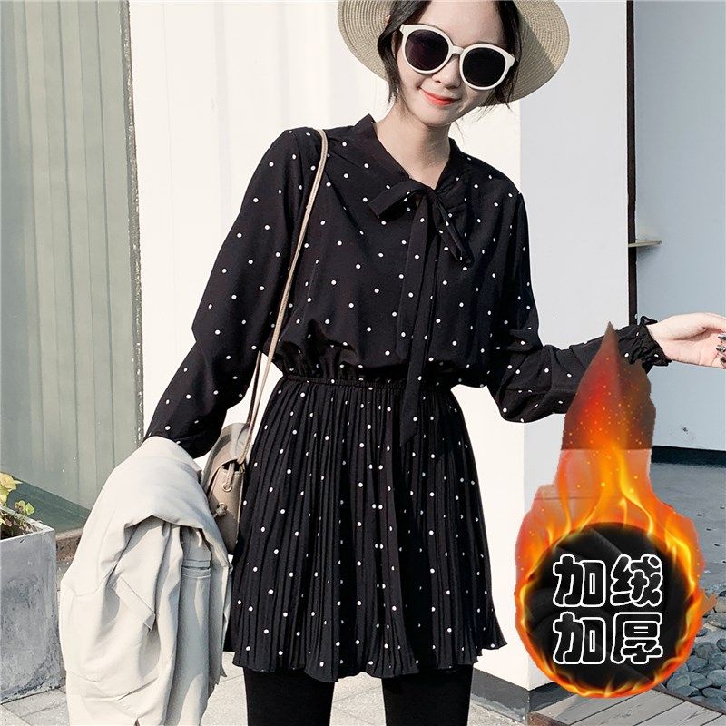 冬装加绒韩版宽松波点长袖雪纺连衣裙衬衫领百搭中长款百褶打底裙