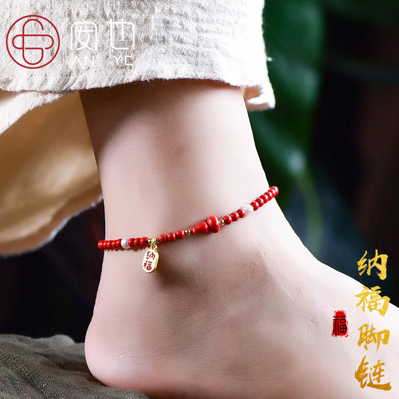 红朱砂脚链女2021新款葫芦纳福红绳脚镯古法脚绳异域腿链网红足链