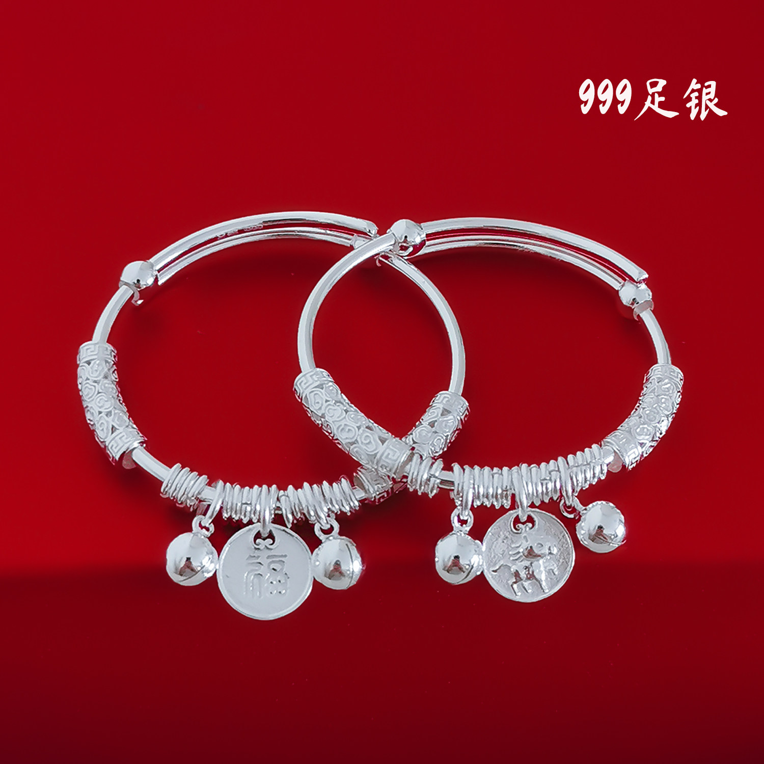 足银999手镯纯银生肖龙蛇马宝宝婴儿周岁满月新生儿铃铛脚镯送礼