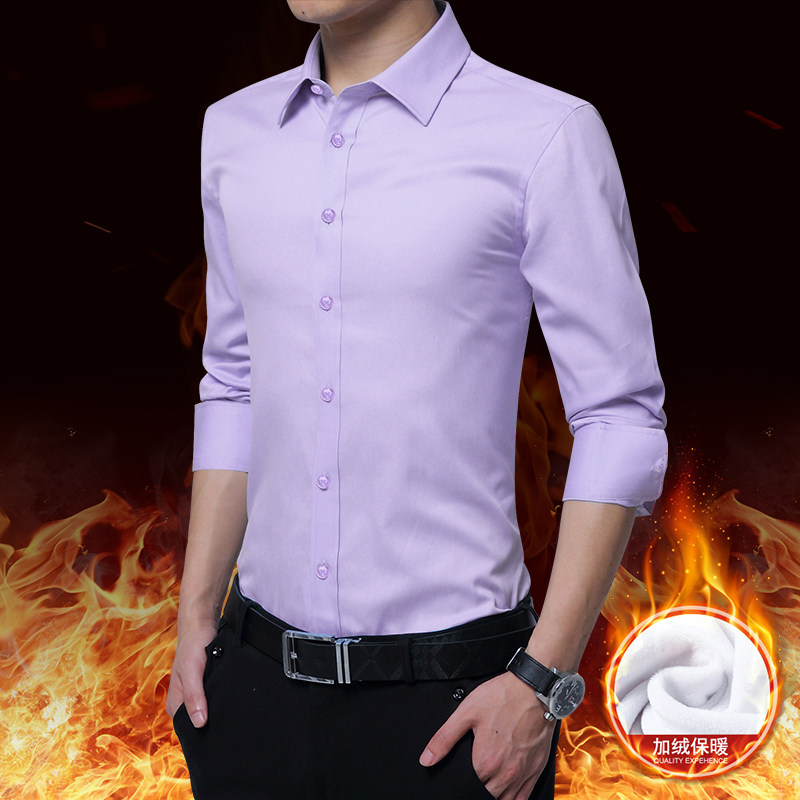 浅紫色加绒衬衫衣男长袖韩版防皱村E杉加厚保暖结婚伴新郎衬衫打