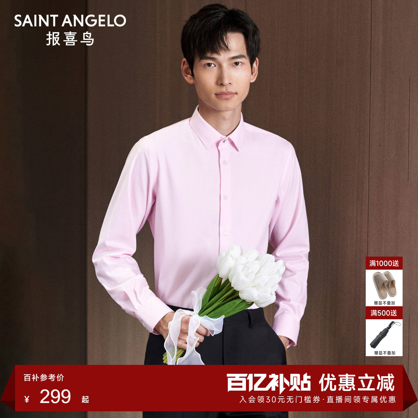 报喜鸟新款男士正装长袖结婚新郎衬衫粉色订婚翻领内搭衬衣男外套