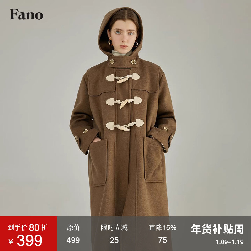 范洛Fano 学院风连帽牛角扣毛呢大衣女2025冬季加厚中长呢子外套
