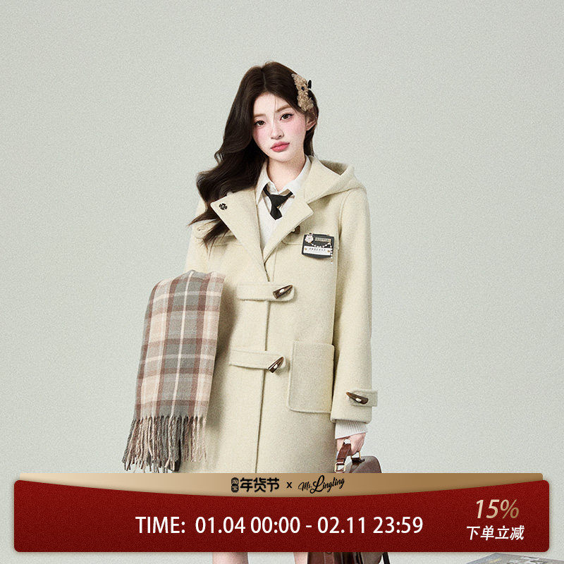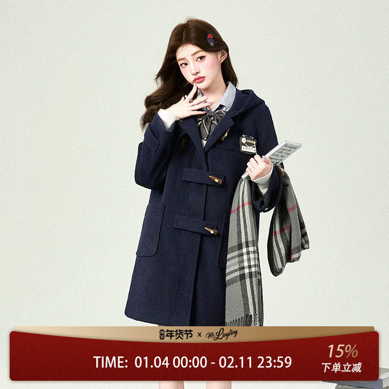 MB MindBridge2025年学院风牛角扣毛呢大衣冬季女连帽羊毛外套