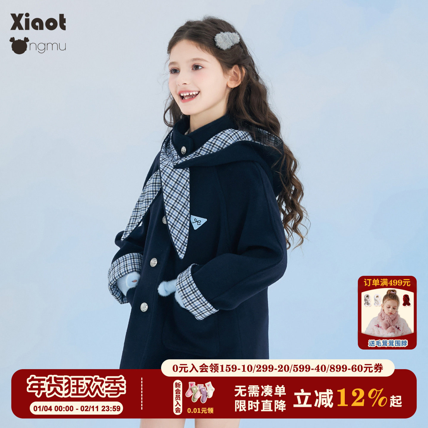 小童木 酷飒学院风女童毛呢大衣冬季新款格纹中大童藏青呢子外套