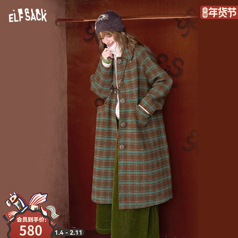 妖精的口袋复古格纹中长款毛呢外套女2025冬新款小个子学院风大衣