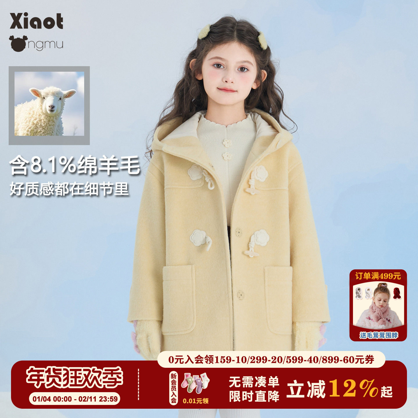 小童木 清新学院风女童毛呢外套冬季新款连帽牛角扣儿童呢子大衣