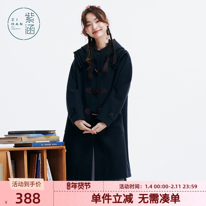 紫涵过膝长款翻领连帽牛角扣毛呢大衣女士冬季新款学院风保暖外套